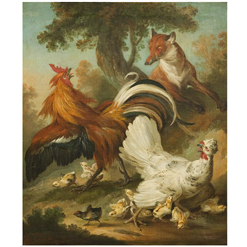 Cock, hen and chickens surprised by a fox
